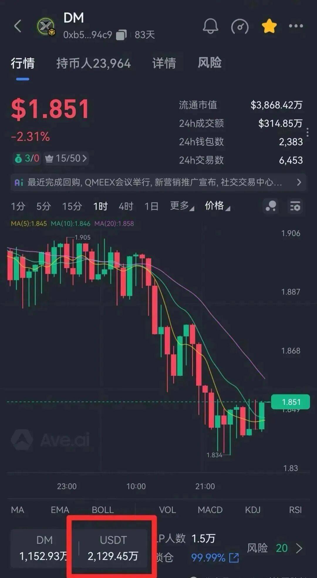 重头戏来了,11 月底的时候,项目方手里握着大量 DM 筹码,开始在二级市场疯狂砸盘,这一砸就砸了一个多星期,币价从 1.9 一路跌到了 1.3。